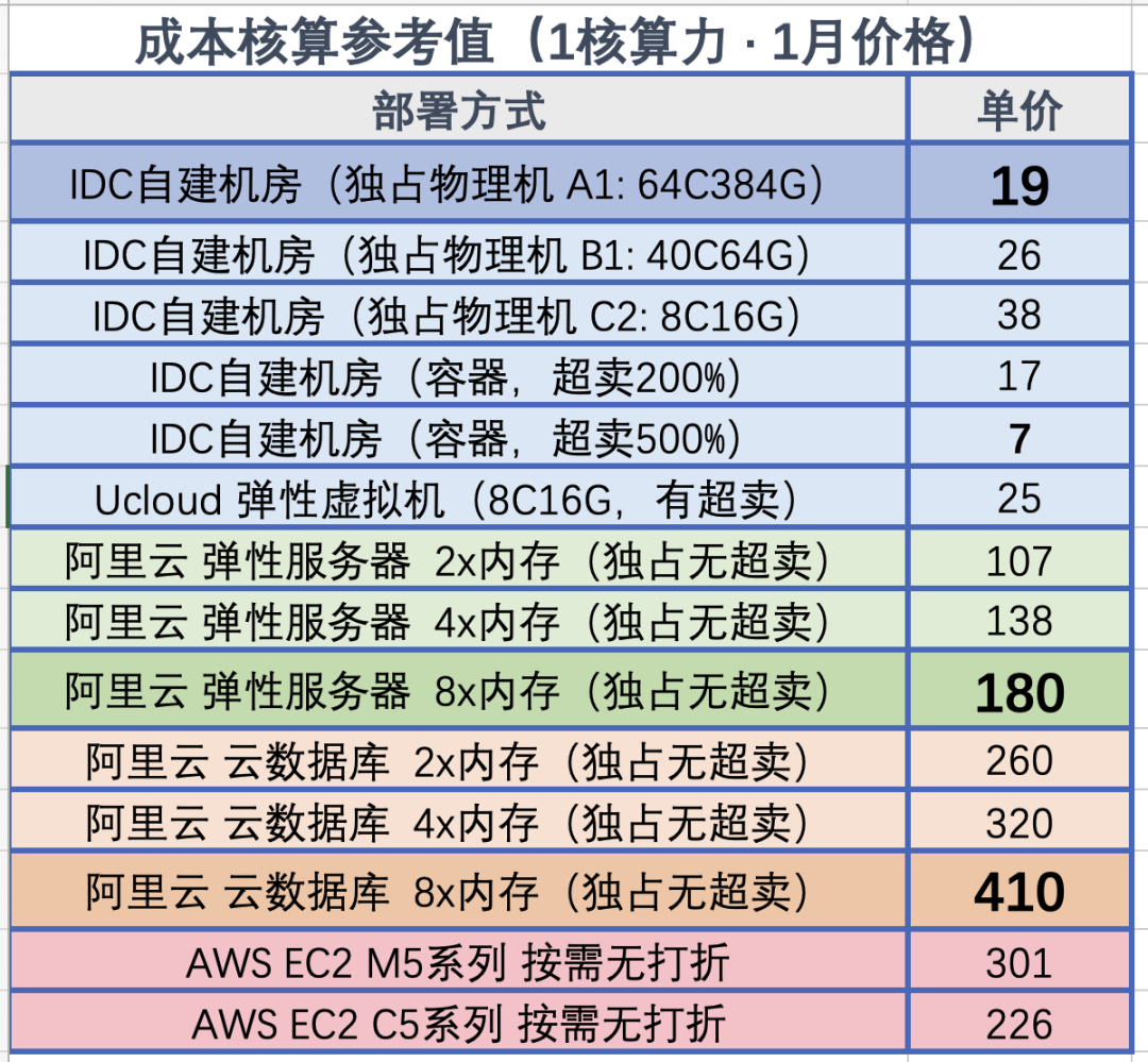Here, we can calculate the unit cost in a simple way: the comprehensive cost of using one core (including memory/disk) for a month, termed as core·month. We have calculated the costs of self-built server types and compared them with the quotes from cloud providers, with the following rough results:
