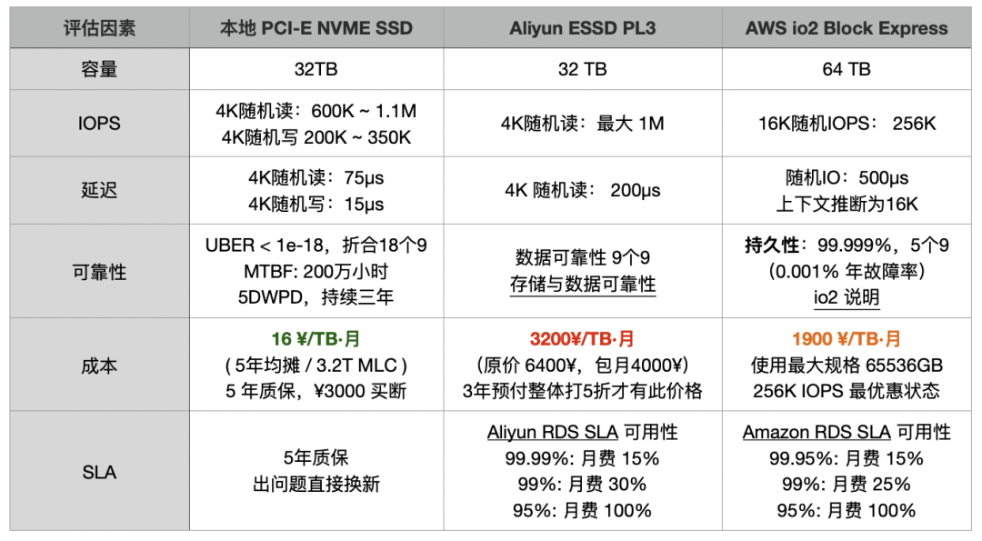 | Factor | Local PCI-E NVME SSD | Aliyun ESSD PL3 | AWS io2 Block Express |