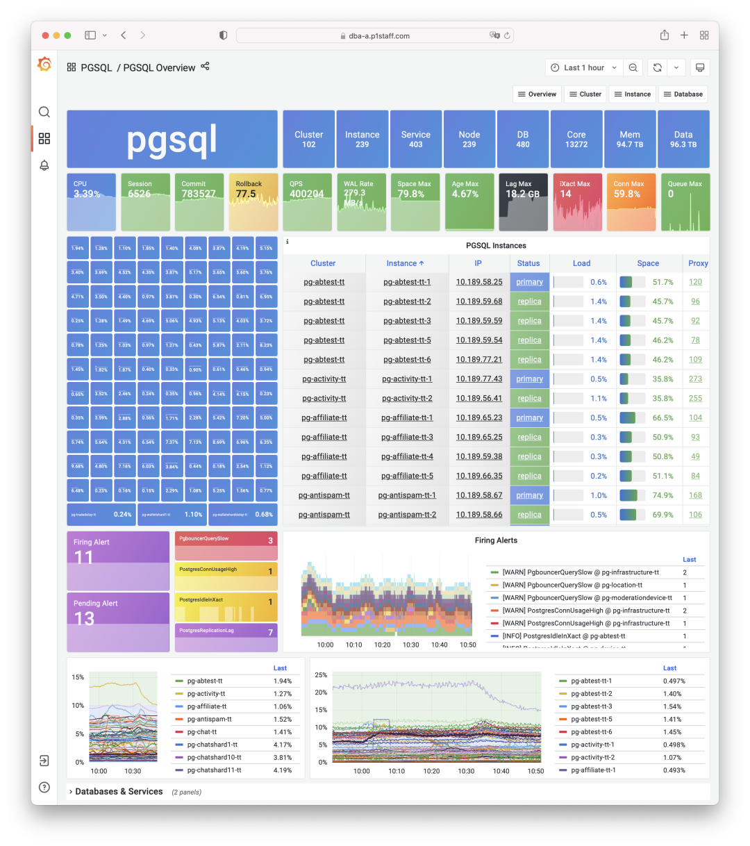 Observability is akin to heaven; as heaven maintains vigor through movement, a gentleman should constantly strive for self-improvement; Pigsty utilizes a modern observability tech stack to create an unparalleled monitoring system for PostgreSQL, offering a comprehensive overview from global dashboards to granular historical metrics for individual tables/indexes/functions, enabling users to see through the system and control everything. Additionally, Pigsty’s monitoring system can operate independently to monitor third-party database instances.