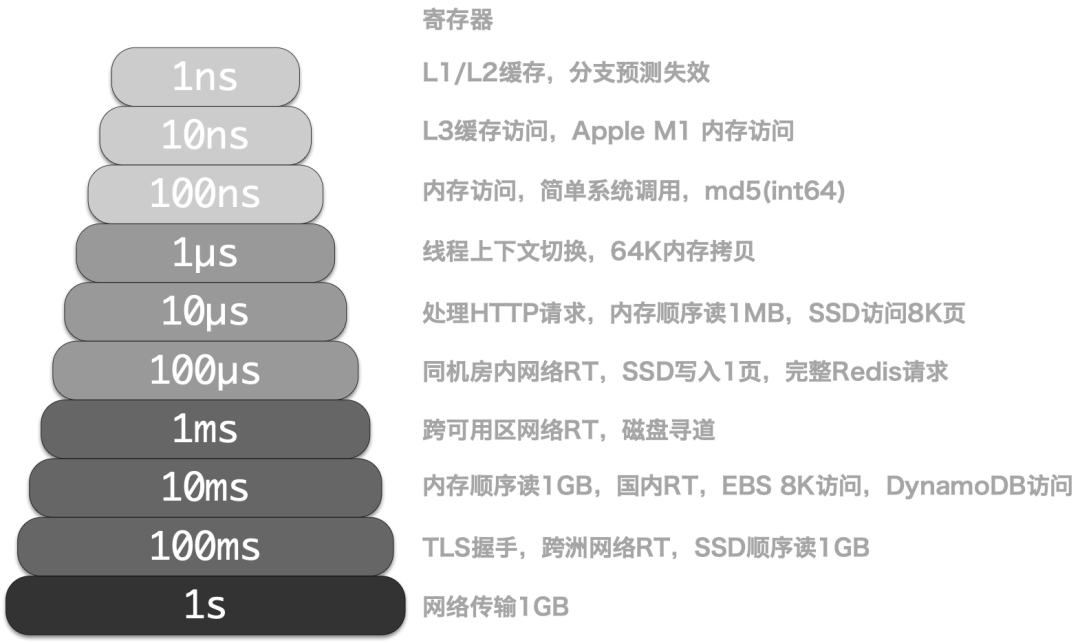 In our production environment, we use local NVME SSDs, with a typical 4K write latency of 15µs and read latency of 94µs. Consequently, the response time for a simple query on PostgreSQL is usually between 100 ~ 300µs, and the response time on the application side typically ranges from 200 ~ 600µs; for simple queries, our SLO is to achieve within 1ms for hits, and within 10ms for misses, with anything over 10ms considered a slow query that needs optimization.