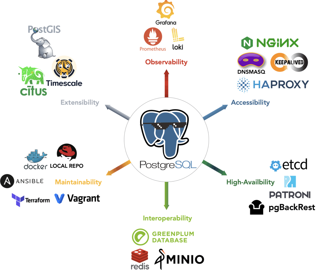 Extensibility is like a lake; as a lake reflects beauty, a gentleman should discuss and practice with friends; Pigsty deeply integrates core PostgreSQL ecosystem extensions like PostGIS, TimescaleDB, Citus, PGVector, and numerous extension plugins. It offers a modular design of the Prometheus/Grafana observability tech stack, and high-availability deployment of MINIO, ETCD, Redis, Greenplum, etc., in combination with PostgreSQL.