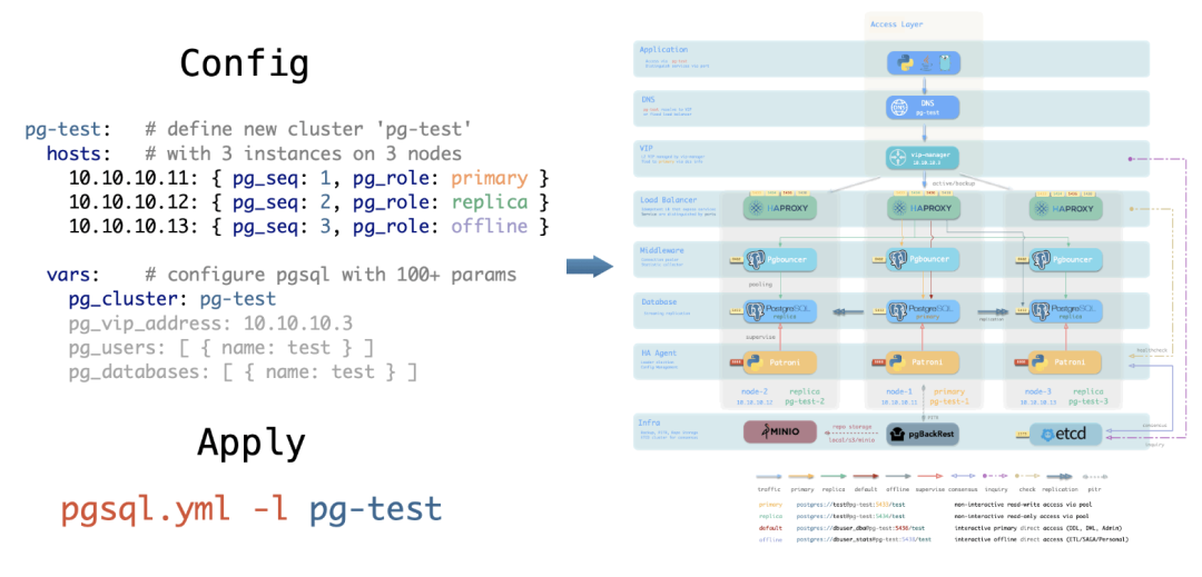 Controllability is akin to earth; as earth’s nature is broad and bearing, a gentleman should carry the world with broad virtue; Pigsty provides Database as Code capabilities: describing the state of database clusters through expressive declarative interfaces and employing idempotent scripts for deployment and adjustments. This allows users to customize finely without worrying about implementation details, freeing their mental capacity and lowering the barrier from expert to novice level in database operations and management.