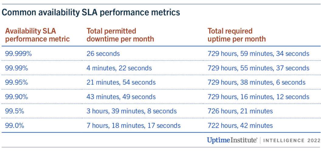 The UPTIME INSTITUTE’s annual data center failure analysis report shows that many cloud services perform below their published SLAs. The analysis of failures in 2022 found that efforts to contain the frequency of failures have failed, and the cost and consequences of failures are worsening [9].