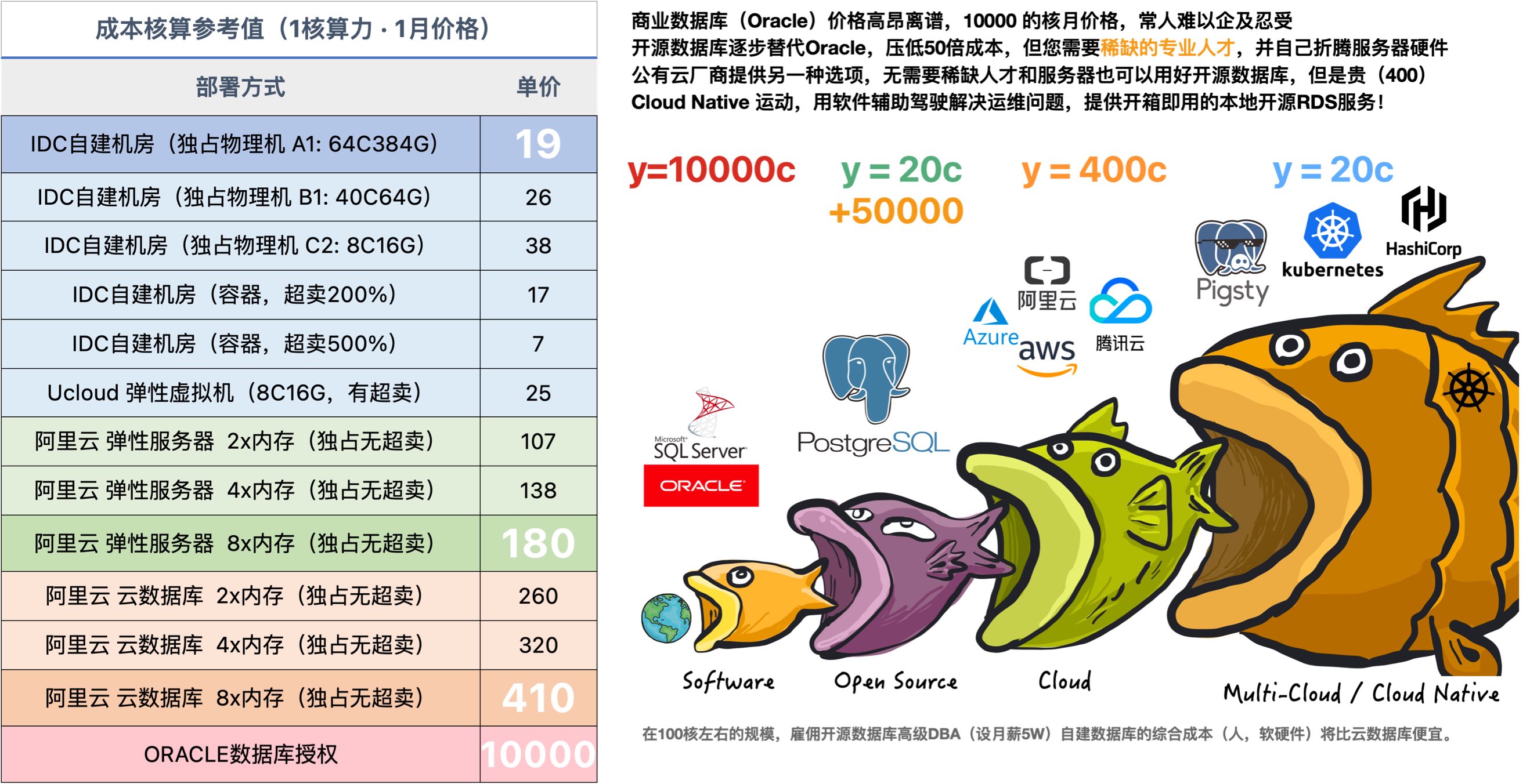 Oracle may be advanced, but PostgreSQL isn’t far behind. In fact, PostgreSQL is the open-source database that’s most compatible with Oracle, covering about 85% of its features out of the box. Special enterprise distributions of PostgreSQL can reach 96% feature compatibility. Meanwhile, Oracle’s massive licensing costs give PG a huge advantage in cost-effectiveness: you don’t necessarily need to exceed Oracle’s capabilities to win; being 90% as good but an order of magnitude cheaper is enough to topple Oracle.