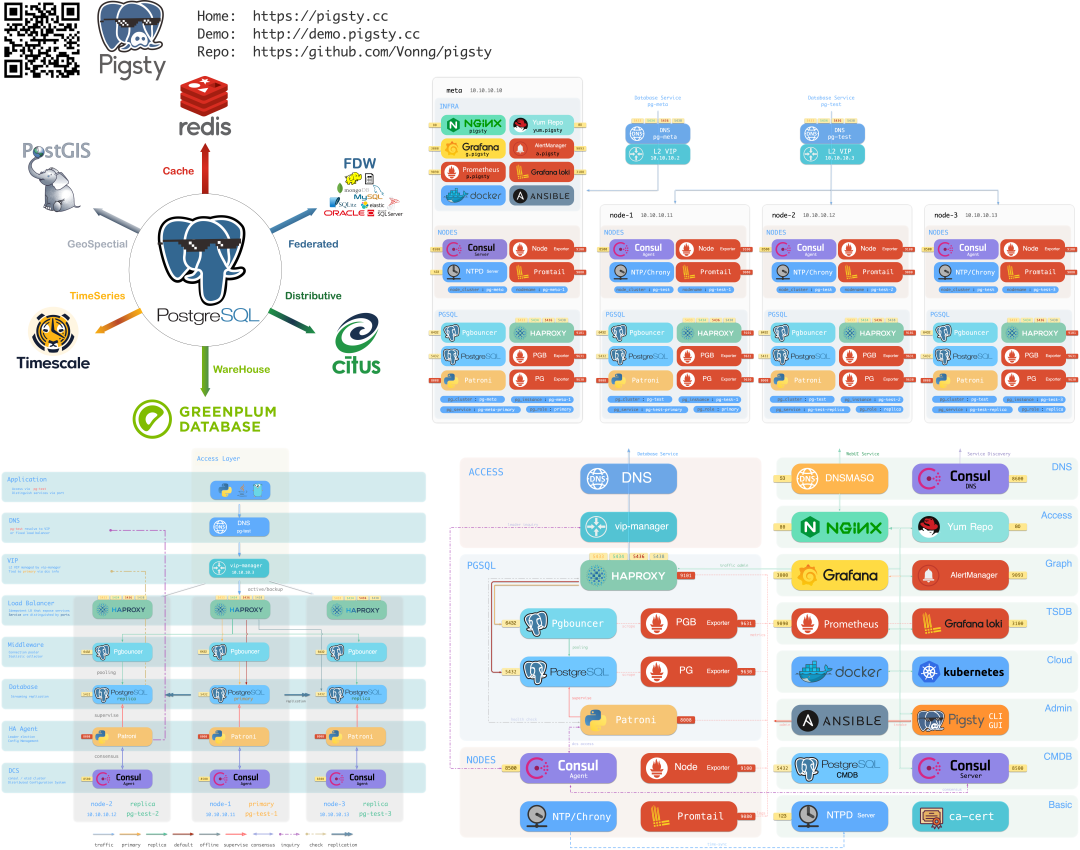 Pigsty comes with out-of-the-box RDS/PaaS/SaaS integration, featuring an unrivaled PostgreSQL monitoring system and an “auto-driving” high-availability cluster solution. It can be installed with a single command, giving you “Database as Code.” You get an experience on par with, or even better than, managed cloud databases, but you own the data, and the cost can be 50–90% lower. We hope it drastically lowers the barriers to using a good database and helps you get the most out of that database.