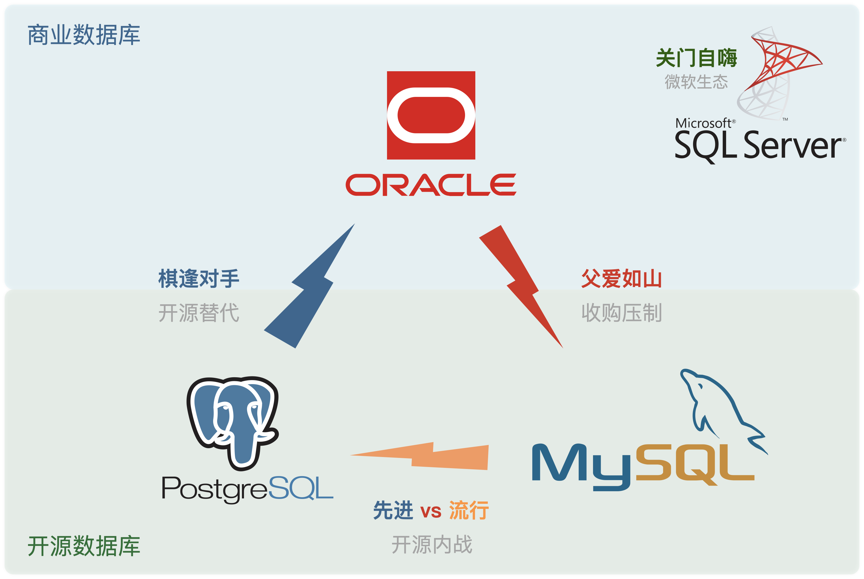 Oracle is a long-established commercial database with an extensive feature set and historical pedigree, widely chosen by enterprises that “have cash to burn and need someone to take the blame.” It has always been at the top of the database market but is also notorious for expensive licensing and aggressive litigation—earning it a reputation as the corporate world’s “toxic troll.” Microsoft’s SQL Server is basically the same style: a commercial database living within a closed ecosystem. All commercial databases have been feeling the squeeze from open-source alternatives and are slowly losing ground.