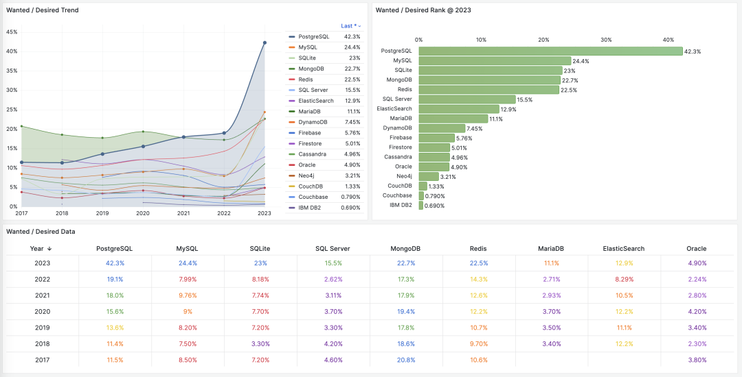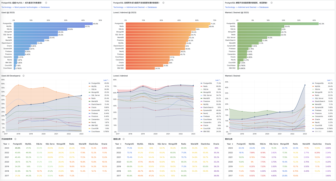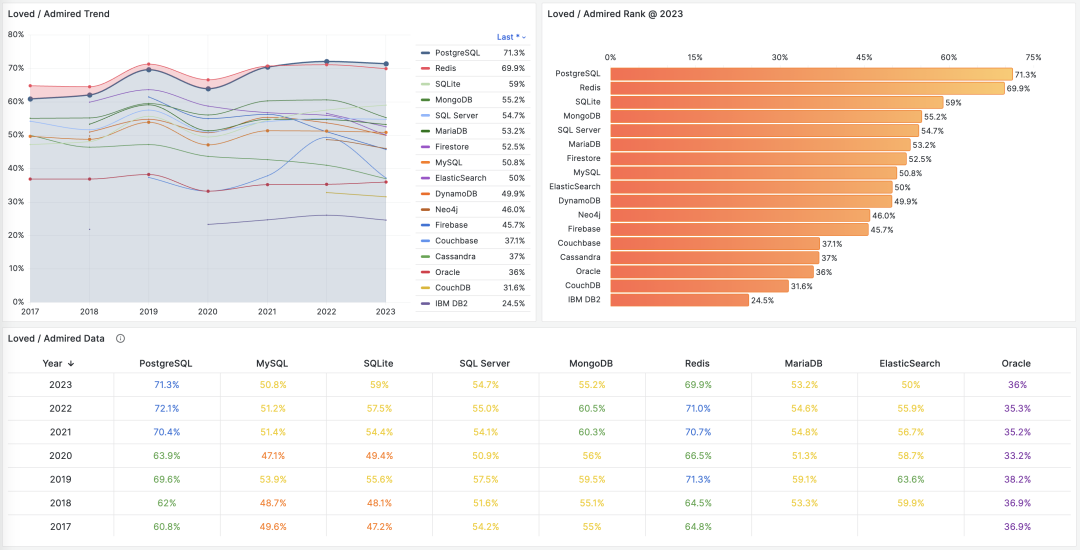 Popularity, the used reflects the past, the loved indicates the present, and the wanted suggests the future. These metrics vividly showcase the vitality of a technology. PostgreSQL stands strong in both stock and potential, unlikely to be rivaled soon.