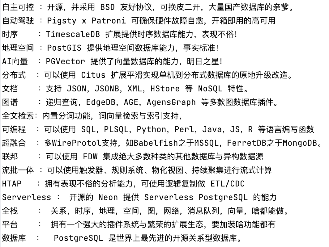 The talent of PG lies in its advancement. Specializing in multiple areas, PostgreSQL offers a full-stack, multi-model approach: “Self-managed, autonomous driving temporal-geospatial AI vector distributed document graph with full-text search, programmable hyper-converged, federated stream-batch processing in a single HTAP Serverless full-stack platform database”, covering almost all database needs with a single component.