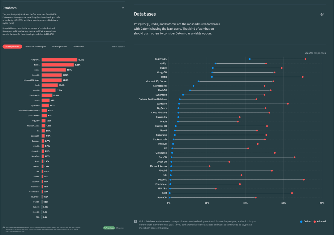 In 2023, PostgreSQL, branded as the “most advanced,” surpassed the “most popular” database MySQL with a usage rate of 45.6%, leading by 4.5% and reaching 1.1 times the usage rate of MySQL at 41.1%. Among professional developers (about three-quarters of the sample), PostgreSQL had already overtaken MySQL in 2022, with a 0.8 percentage point lead (46.5% vs 45.7%); this gap widened in 2023 to 49.1% vs 40.6%, or 1.2 times the usage rate among professional developers.