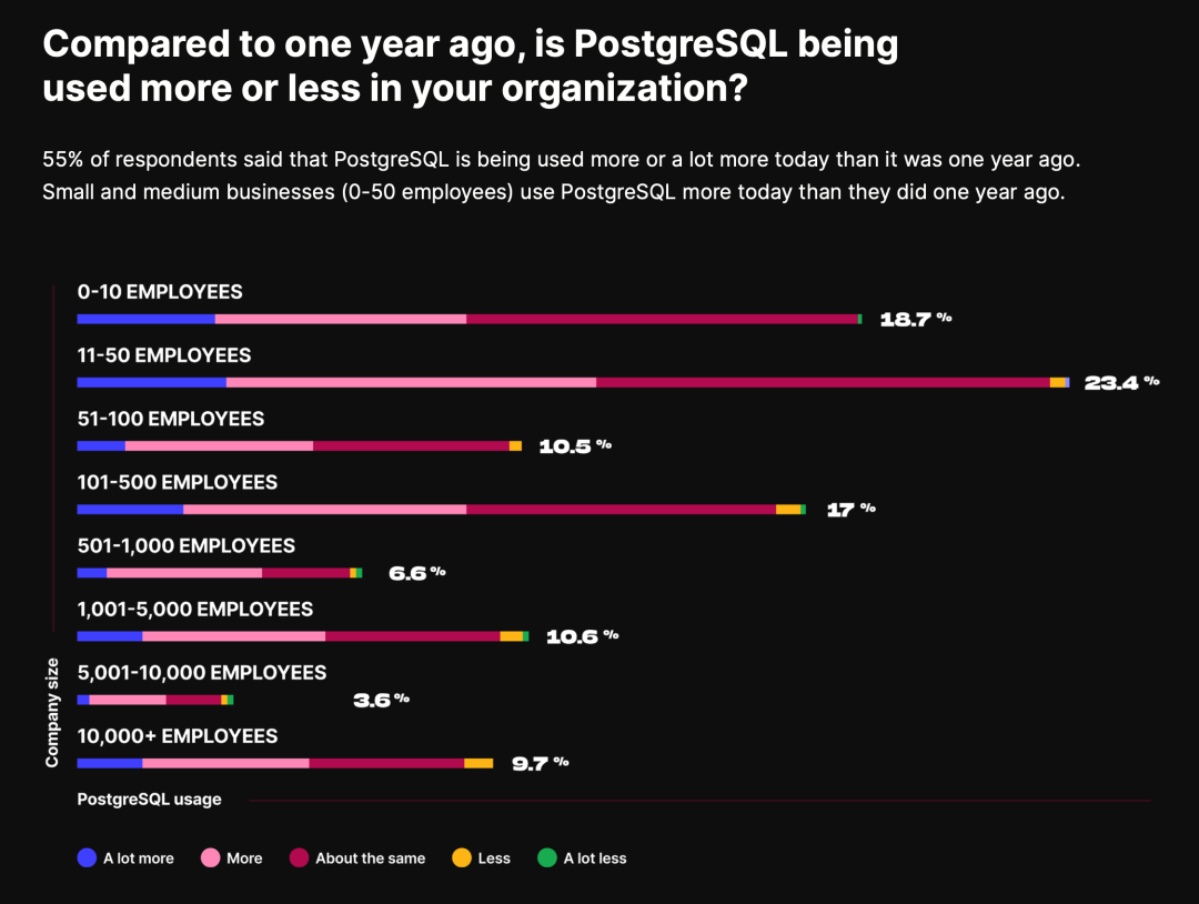 In the 2022 PostgreSQL community survey, the majority of existing PostgreSQL users reported increased usage and deeper engagement, highlighting the stability of its core user base.
