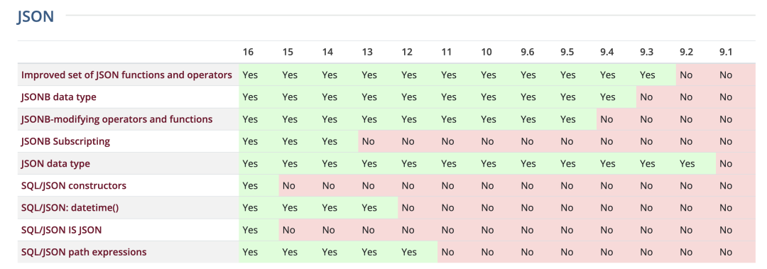 PostgreSQL JSON 特性矩阵