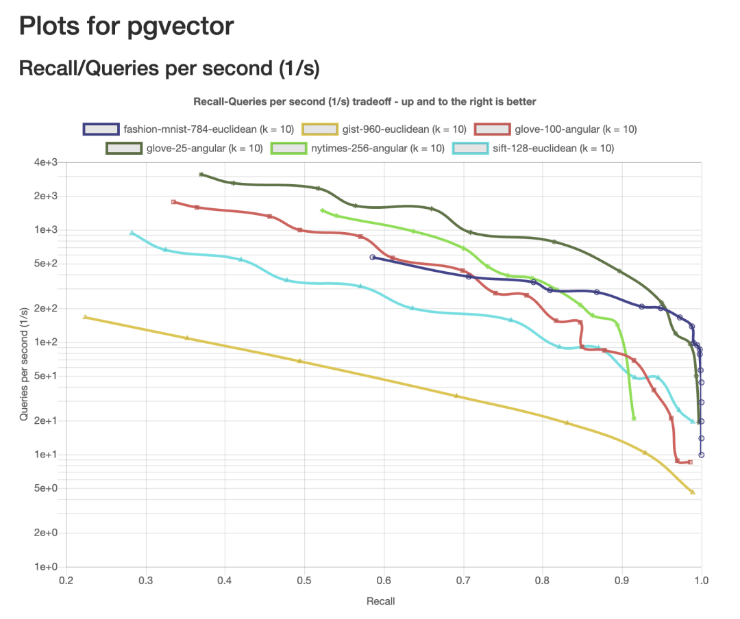 pgvector 在 ANN Benchmark 各测试集下的召回率/性能曲线